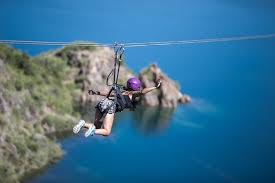 Deslizamiento por cables instalados sobre el paisaje serrano; aventura rápida con vista al lago.