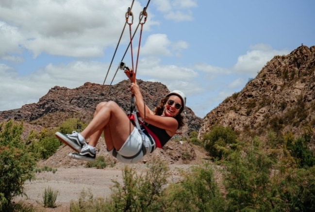 Vuelos en tirolesas sobre los cañadones y el río, con vistas espectaculares desde las alturas.