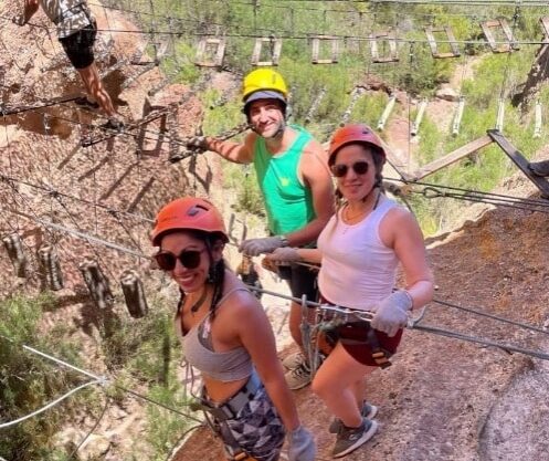 Escalada asistida con cables y peldaños metálicos adheridos a la roca; experiencia segura con panorama vertical del cañón.